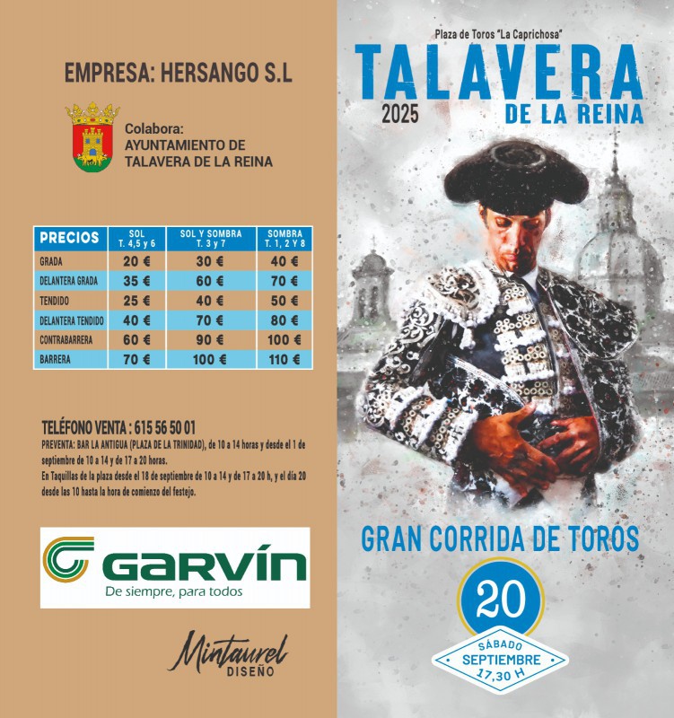 Tras la presentación del cartel de la esperada corrida de toros de San Mateo 2025 en Talavera de la Reina (Toledo), la venta de entradas continúa activa para el evento taurino que tendrá lugar el próximo sábado 20 de septiembre en la Plaza de Toros La Caprichosa.