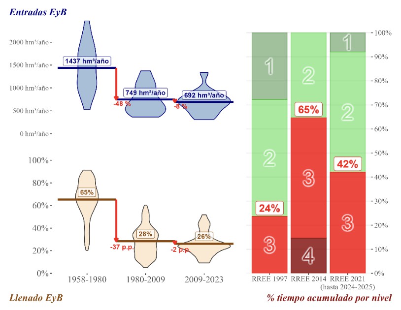 El llenado medio de los embalses ha pasado del 65 % en el periodo 1958-1980 a apenas un 26 % en el actual. La capacidad física de almacenamiento de agua sigue siendo la misma, pero las Reglas de Explotación han favorecido operar los embalses en niveles bajos para reducir la evaporación y poder de esta forma maximizar el trasvase medio. Esa estrategia ha tenido un coste alto: más irregularidad en los trasvases y más tiempo en situaciones de excepcionalidad.