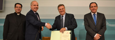 El presidente de la Diputación de Toledo, Arturo García-Tizón, y el director de Cáritas Diocesana de Toledo, Antonio Espíldora, han firmado hoy un convenio de colaboración por el que la Institución destinará 100.000 euros al programa denominado “Acogida y Atención a familias necesitadas de la provincia de Toledo”. En la firma de este importante acuerdo, también han estado presentes el vicario responsable del Área de Acción Social, Felipe García, y el diputado provincial de Sanidad y Bienestar Social, Jesús Guerrero.