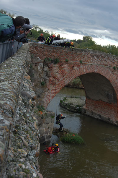 Se eligio una zona de corrientes entre dos ojos del Puente Romano para estabilizar a la víctima, montarla y la camilla y subirla por una escala corredera sirviéndose de un tretrápode, que incorporaba cuerda y polea, para el izado. Esta estructura permitió salvar la vertical del puente y asegurar que que las persona sufriera los menores movimientos posibles por la posible existencia de daños severos. Una vez en superficie, serían los servicios sanitarios los que continuarían con el protocolo comenzando por el traslado hospitalario, comentó el cabo José Luis Ahijado.