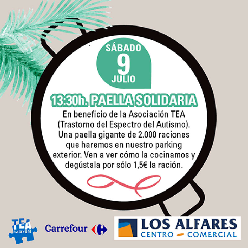 Este sábado 9 de julio a las 13:30 horas en el Centro Comercial Los Alfares tendrá lugar una Paella Solidaria en beneficio de la Asociación TEA Talavera (Trastorno del Espectro del Autismo). Una paella gigante de 2.000 raciones que se llevará a cabo en el Parking exterior del centro talaverano.