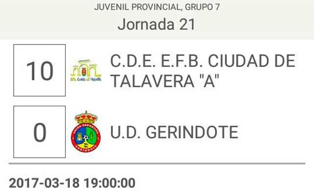 A las 19 horas, el Ciudad de Talavera 'A' recibía a la Unión Deportiva Gerindote, para disputar el encuentro de la jornada 21 perteneciente a la Liga Juvenil Provincial. Nada más comenzar el partido, que acabó ganando 10-0 el equipo cerámico, el jugador juvenil Christopher Fernández, de 17 años, del equipo rival tuvo que ser trasladado en el vehículo de un particular al Hospital 'Nuestra Señora del Prado', tras sufrir una aparatosa caída en un lance del juego.