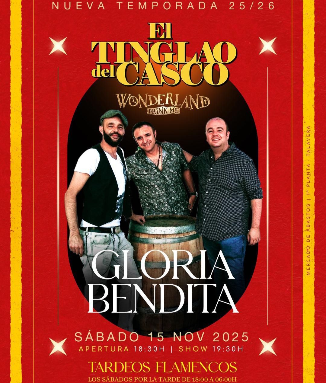 Las puertas abrirán a las 18:30 horas, dando paso a una tarde cargada de ritmo y buen ambiente. A partir de las 19:30 horas comenzará el espectáculo principal, que en esta ocasión contará con la actuación en directo del grupo “Gloria Bendita”, conocidos por su energía en el escenario y un estilo flamenco lleno de arte y sentimiento.