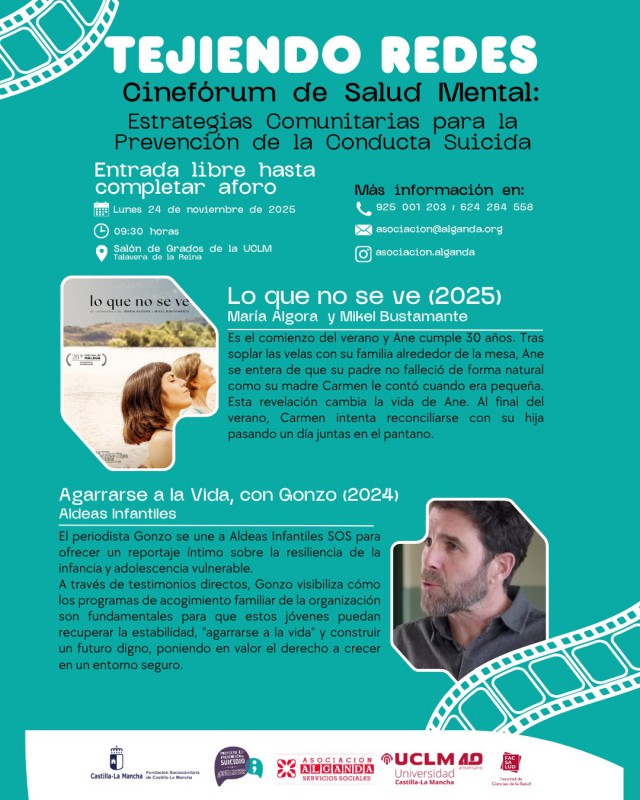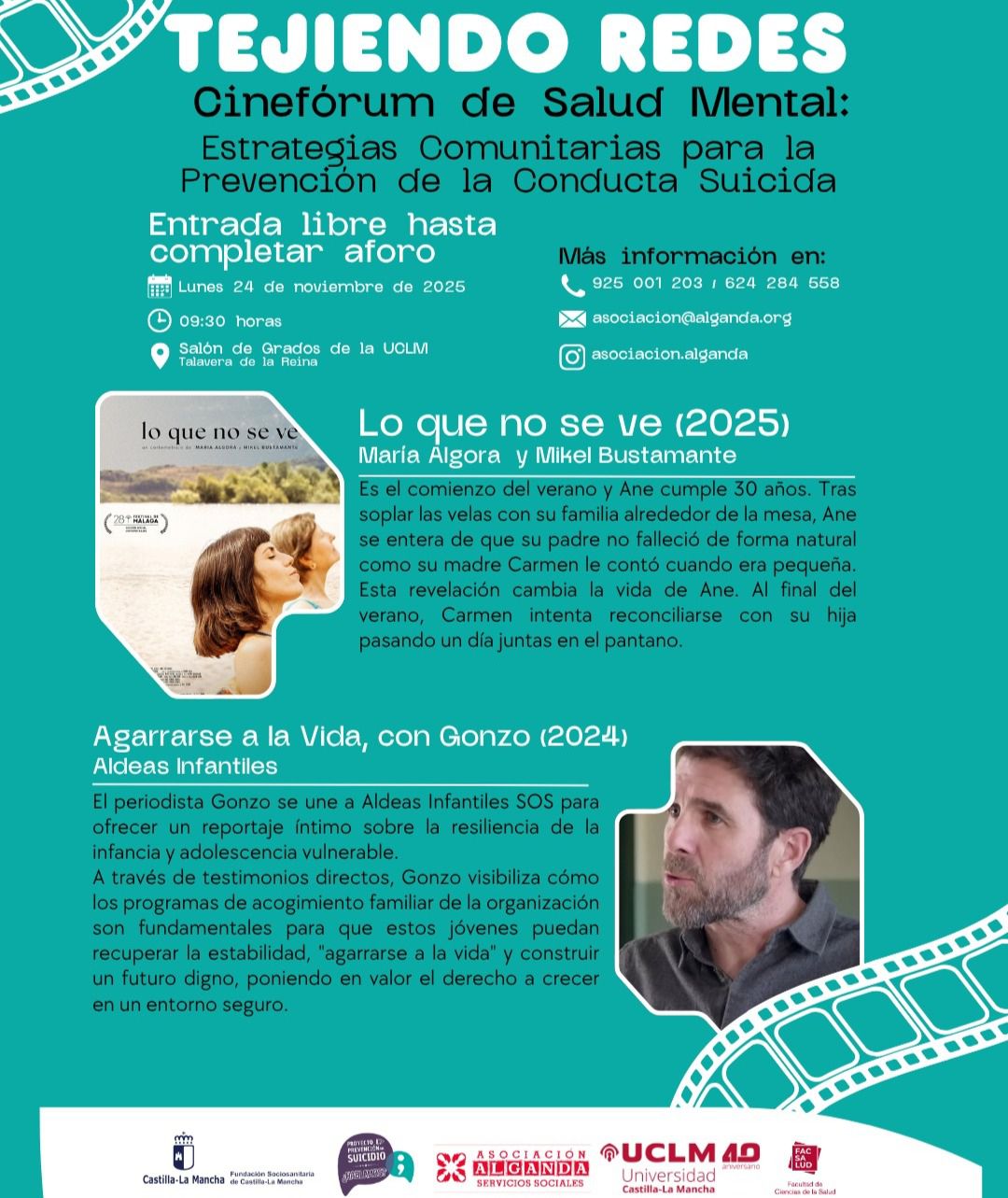 La Facultad de Ciencias de la Salud de la Universidad de Castilla-La Mancha (UCLM), en colaboración con la Asociación Alganda Servicios Sociales y con el apoyo de la Fundación Sociosanitaria de Castilla-La Mancha, organiza el cinefórum “Tejiendo Redes: Estrategias Comunitarias para la Prevención de la Conducta Suicida”, una jornada dedicada a la sensibilización y reflexión sobre la salud mental desde una perspectiva comunitaria. Esta actividad forma parte del compromiso de la UCLM y la Facultad de Ciencias de la Salud con la promoción de la salud mental y el bienestar emocional en la comunidad.