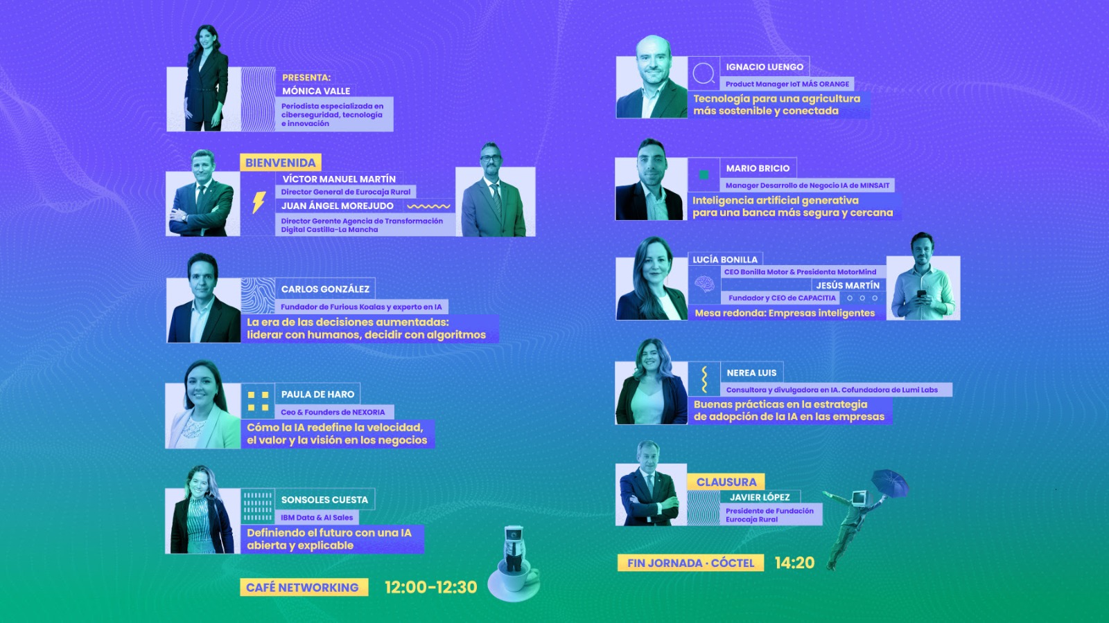 El viernes a las 10.00 de la mañana el director general de Eurocaja, Víctor Manuel Martín López, y el director de la Agencia de Transformación Digital de Castilla-La Mancha, Juan Ángel Morejudo Flores, darán la bienvenida a las personas asistentes al DIGITAL SUMMIT, quienes podrán disfrutar de las ponencias de Carlos González, Fundador de Furious Koalas y experto en IA; Paula de Haro, CEO de Nexoria, inversora y conferenciante internacional en IA; Sonsoles Cuesta, IBM Data & Sales; Ignacio Luengo, Product Manager IoT de MásOrange; Mario Bricio, Manager de Desarrollo de Negocio IA de MINSAIT; Lucía Bonilla, CEO de Bonilla Motor & Presidenta de Motormind; Jesús Martín, Fundador y CEO de Capacitia, y la ponencia de Nerea Luis, consultora y divulgadora de IA.