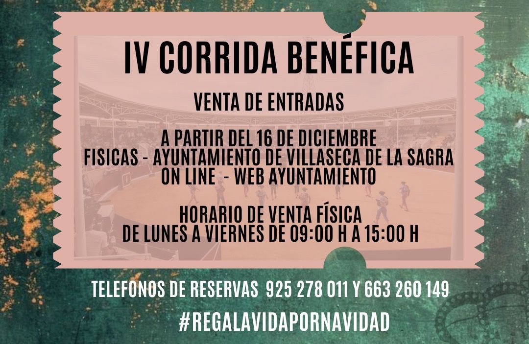 Villaseca de la Sagra ha abierto hoy la venta de entradas para la IV Corrida Benéfica, que se celebrará el sábado 21 de marzo de 2026 a las 17:30 horas. La iniciativa tiene como objetivo apoyar la investigación contra el cáncer infantil a través del proyecto de Inmunoterapia Avanzada de la Fundación Oncohematología Infantil.