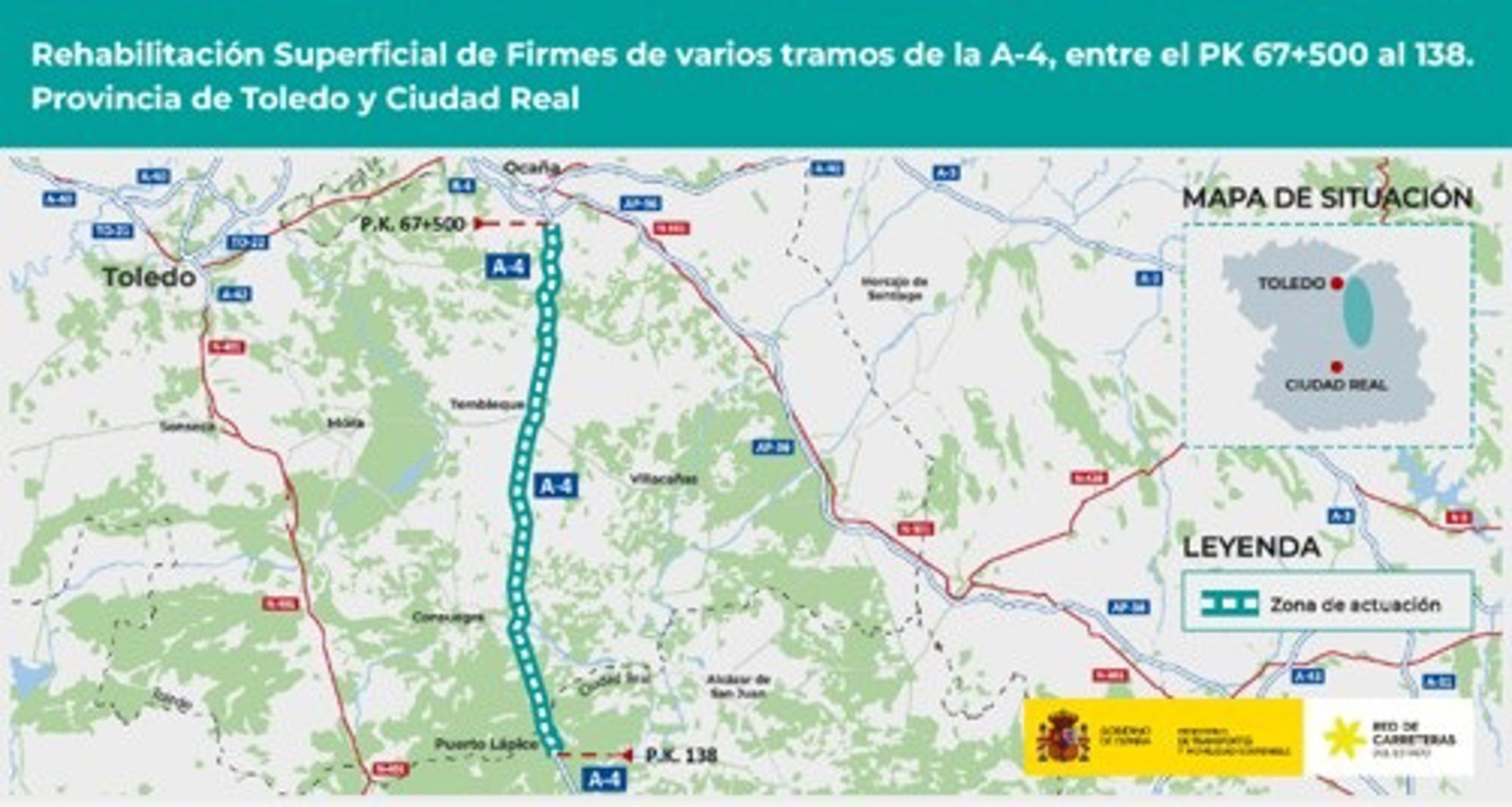 El Ministerio de Transportes y Movilidad Sostenible ha adjudicado por un importe de 18.218.619,10 euros (IVA incluido) el contrato de obras para la rehabilitación superficial del firme en varios tramos de la autovía A-4, entre los kilómetros 67,5 y 138, en las provincias de Toledo y Ciudad Real.