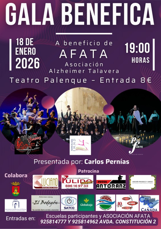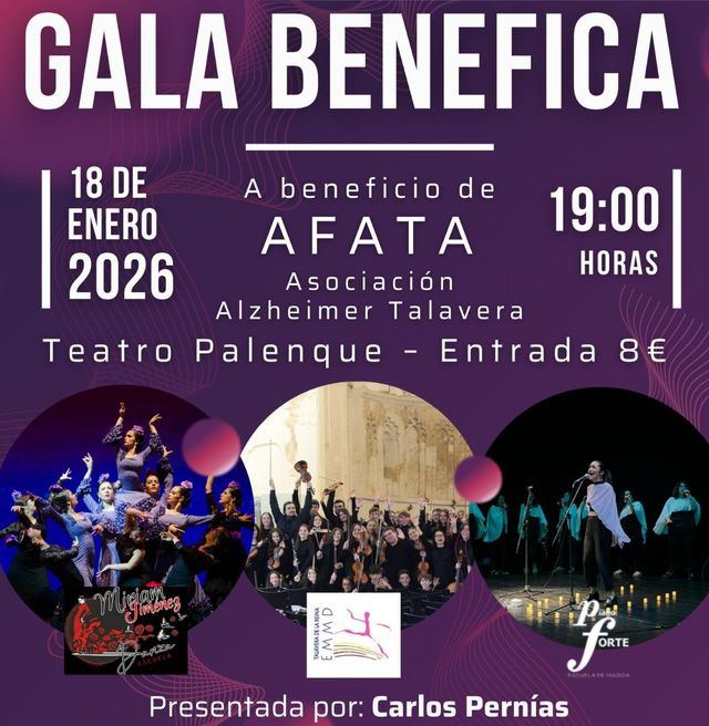 Talavera de la Reina acogerá el próximo 18 de enero de 2026, a las 19:00 horas, una Gala Benéfica organizada por AFATA, la Asociación de Familiares y Amigos de Personas con Deterioro Cognitivo, Enfermedad de Alzheimer y otras Demencias de Talavera. El evento tendrá lugar en el Teatro Palenque y contará con la participación de destacadas agrupaciones artísticas de la ciudad.