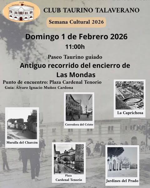 La programación se completará el domingo 1 de febrero, a las 11:00 horas, con un paseo taurino guiado por el antiguo recorrido del encierro de Las Mondas, con salida desde la Plaza Cardenal Tenorio. La actividad estará conducida por Álvaro Ignacio Muñoz Cardona y recorrerá distintos enclaves históricos vinculados a la tradición taurina de la ciudad.