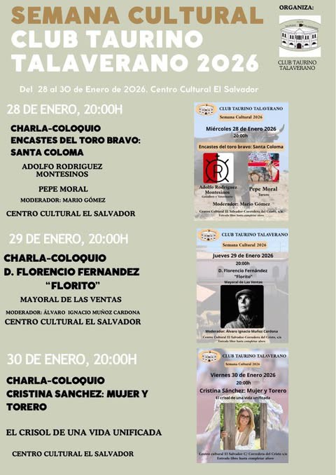Las actividades culturales se desarrollarán los días 28, 29 y 30 de enero, a las 20:00 horas, en el Centro Cultural El Salvador. El miércoles 28 tendrá lugar la charla sobre los encastes del toro bravo, con la participación de Adolfo Rodríguez Montesinos y Pepe Moral, moderados por Mario Gómez. El jueves 29 será el turno de Florencio Fernández 'Florito', mientras que el viernes 30 cerrará el ciclo Cristina Sánchez, con una charla centrada en su trayectoria personal y profesional.