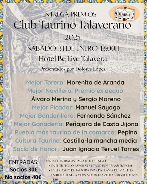 Como colofón a la Semana Cultural, el sábado 31 de enero se celebrará la comida y entrega de premios del Club Taurino Talaverano, a partir de las 13:00 horas, en el Hotel Be Live Talavera. Durante el acto se reconocerá a los protagonistas más destacados de la temporada 2025, entre ellos Morenito de Aranda como Mejor Torero, así como a Álvaro Merino y Sergio Moreno como Mejores Novilleros ex aequo, además de otros premios a profesionales, ganaderías y entidades.