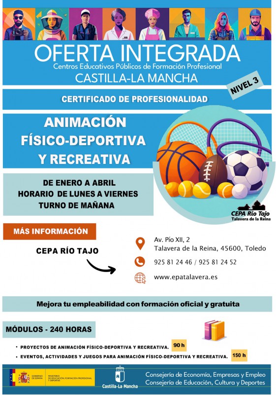 El Centro de Educación de Personas Adultas Río Tajo de Talavera de la Reina (Toledo) pone en marcha una nueva acción formativa dentro de su oferta educativa. A partir de finales del mes de enero de 2026, el centro impartirá el certificado profesional de Animación Físico-Deportiva y Recreativa.
