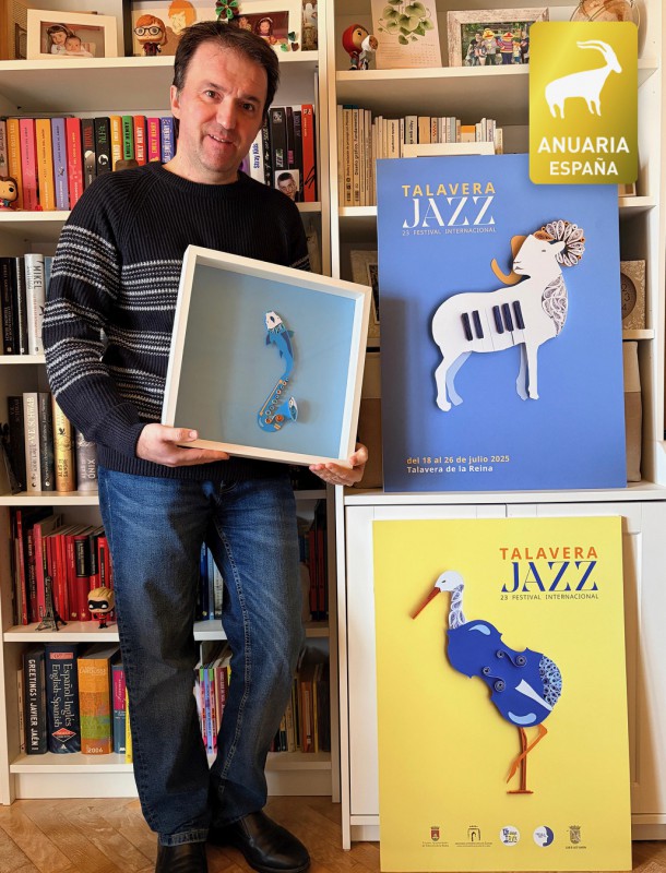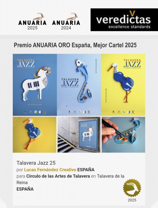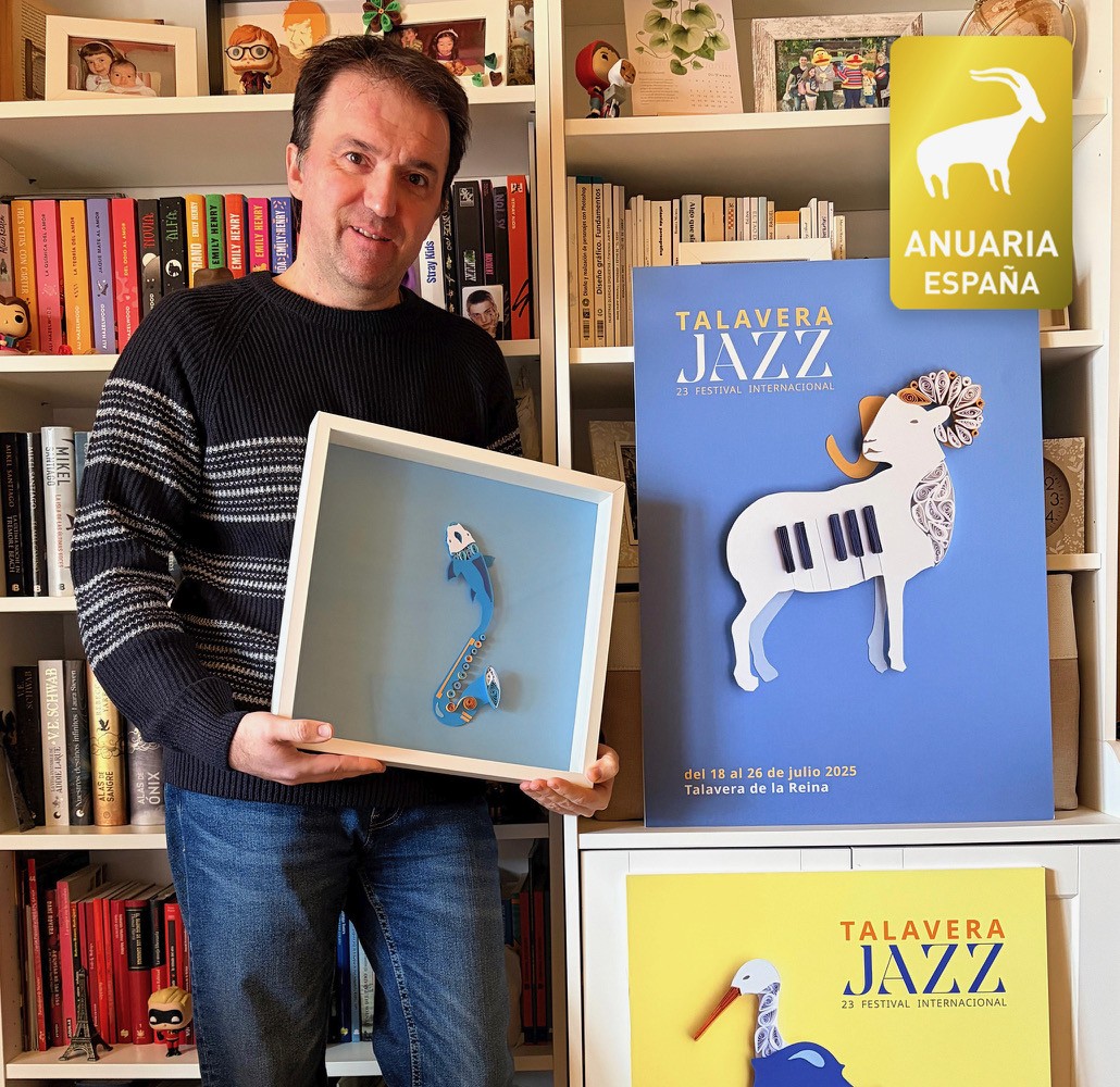 Su última obra realizada para anunciar el Festival Internacional de Jazz Ciudad de Talavera 2025 ha conseguido la máxima distinción Anuaria ORO en la categoría de Mejor Cartel.