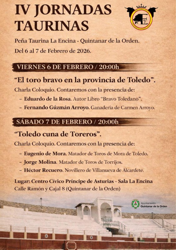 Quintanar de la Orden (toledo) acogerá los próximos viernes 6 y sábado 7 de febrero las IV Jornadas Culturales Taurinas, organizadas por la Peña Taurina La Encina.