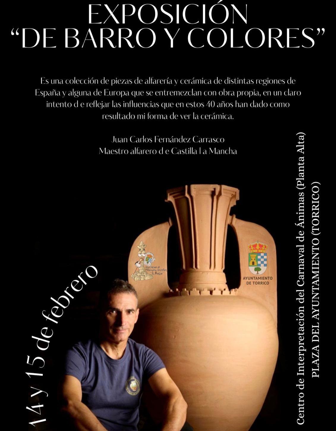 El Centro de Interpretación del Carnaval de Ánimas de Torrico acogerá los próximos 14 y 15 de febrero la exposición “De Barro y Colores”, una muestra que reúne piezas de alfarería y cerámica tradicional procedentes de diferentes regiones de España y algunos países europeos, combinadas con obra propia del maestro alfarero Juan Carlos Fernández Carrasco, natural de Puente del Arzobispo y recientemente reconocido como Maestro Artesano de Castilla-La Mancha.