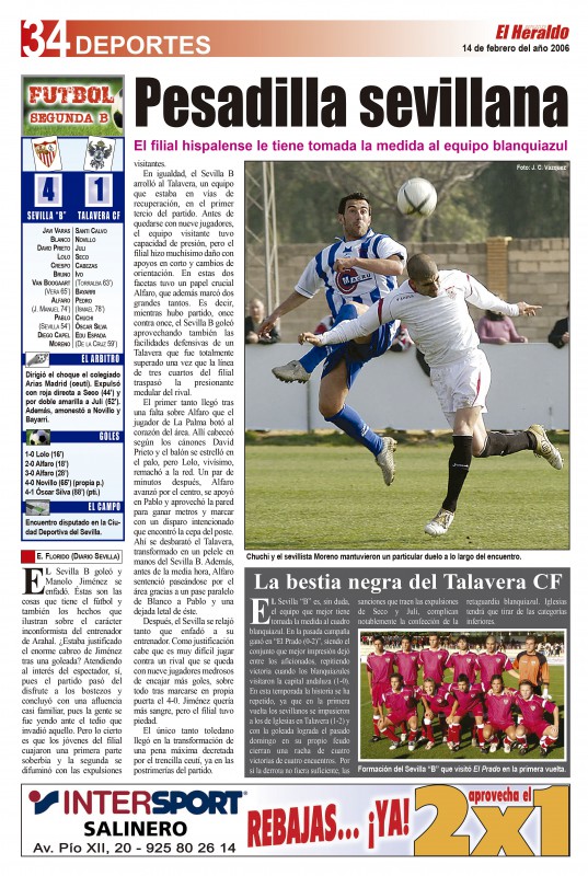 El Talavera CF cayó en Sevilla por 4-1 ante el filial de Nervión y se convertía, sin duda, el equipo que mejor tiene tomada la medida al cuadro blanquiazul. En la pasada campaña ganó en “El Prado (0-2)”, siendo el conjunto que mejor impresión dejó entre los aficionados, repitiendo victoria cuando los blanquiazules visitaron la capital andaluza (1-0). En esta temporada la historia se ha repetido, ya que en la primera vuelta los sevillanos se impusieron a los de Iglesias en Talavera (1-2) y con la goleada lograda el pasado domingo en su propio feudo cierran una racha de cuatro victorias de cuatro encuentros. Por si la derrota no fuera suficiente, las sanciones que traen las expulsiones de Seco y Juli, complican notablemente la confección de la retaguardia blanquiazul. Iglesias tendrá que tirar de las categorías inferiores.