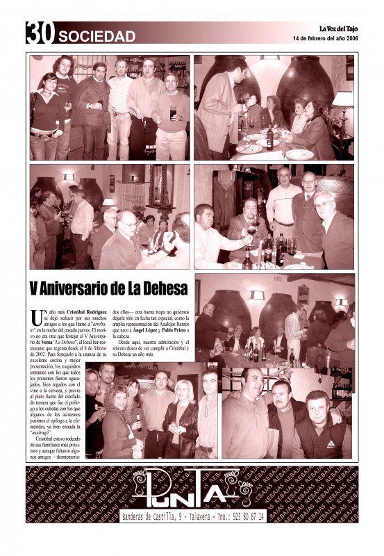 Un año más Cristóbal Rodríguez se dejó seducir por sus muchos amigos a los que llamó a “arrebato” en la noche del pasado jueves. El motivo no era otro que festejar el V Aniversario de Venta “La Dehesa”, el local bar-restaurante que regenta desde el 8 de febrero de 2002. Para festejarlo a la usanza de su excelente cocina y mejor presentación, los exquisitos entrantes con los que todos los presentes fueron agasajados, bien regados con el vino o la cerveza, y previo al plato fuerte del estofado de ternera que fue el prólogo a los cubatas con los que algunos de los asistentes pusimos el epílogo a la efemérides, ya bien entrada la “madrugá”.