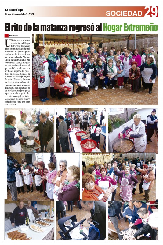Un año más la veterana asociación del Hogar Extremeño Talaverano quiso rememorar la tradicional matanza en una jornada que se celebró en las instalaciones que posee en la calle Mariano Ortega de nuestra ciudad. Allí coincidieron muchos integrantes para celebrar el evento, al que también acudieron, por invitación expresa del presidente del Hogar, el alcalde de la ciudad y el concejal Miguel Perantón. El ritual y las costumbres que acompañan a este viejo rito movieron a decenas de personas que disfrutaron de los excelentes manjares que se repartieron a lo largo del día. Los más madrugadores incluso pudieron degustar churros recién hechos, junto a un buen café calentito.