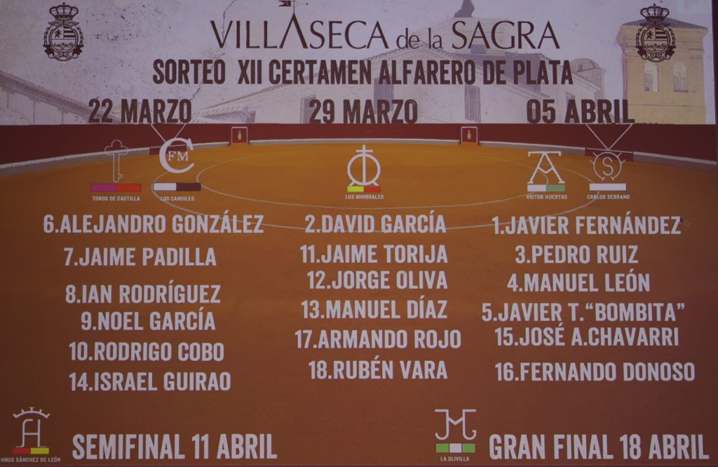 La semifinal del certamen se disputará el 11 de abril con novillos de Hnos. Sánchez de León, mientras que la gran final se celebrará el 18 de abril con reses de La Olivilla, ganadería vinculada a momentos decisivos del Alfarero de Plata en ediciones anteriores.