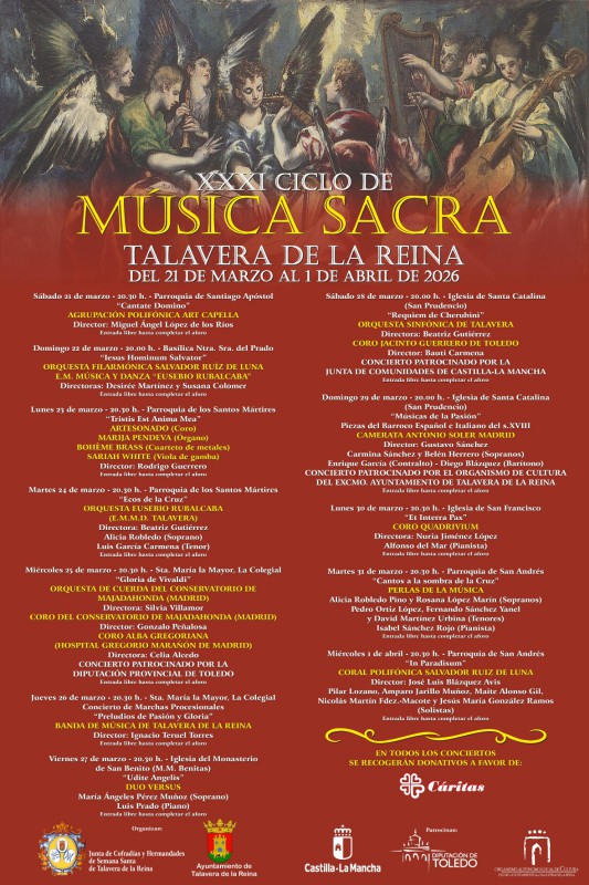 Un año más, vuelve a Talavera de la Reina (Toledo) el Ciclo de Música Sacra, que este 2025 celebra su XXXI edición. Este nuevo Ciclo comenzará este próximo sábado 21 de marzo y se prolongará hasta el próximo 1 de abril.