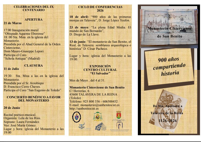 Además, en Talavera de la Reina, el Císter de las Madres Benitas, como popularmente se las conoce en la ciudad, se disponen a celebrar el IX centenario de su establecimiento en la Ciudad de la Cerámica. La santa Misa que tendrá lugar por la tarde será el inicio de las celebraciones de este gran aniversario al que se sumará un ciclo de conferencias, un concierto y una exposición hasta que se clausure el 11 de julio, coincidiendo con la fiesta del Abad San Benito.