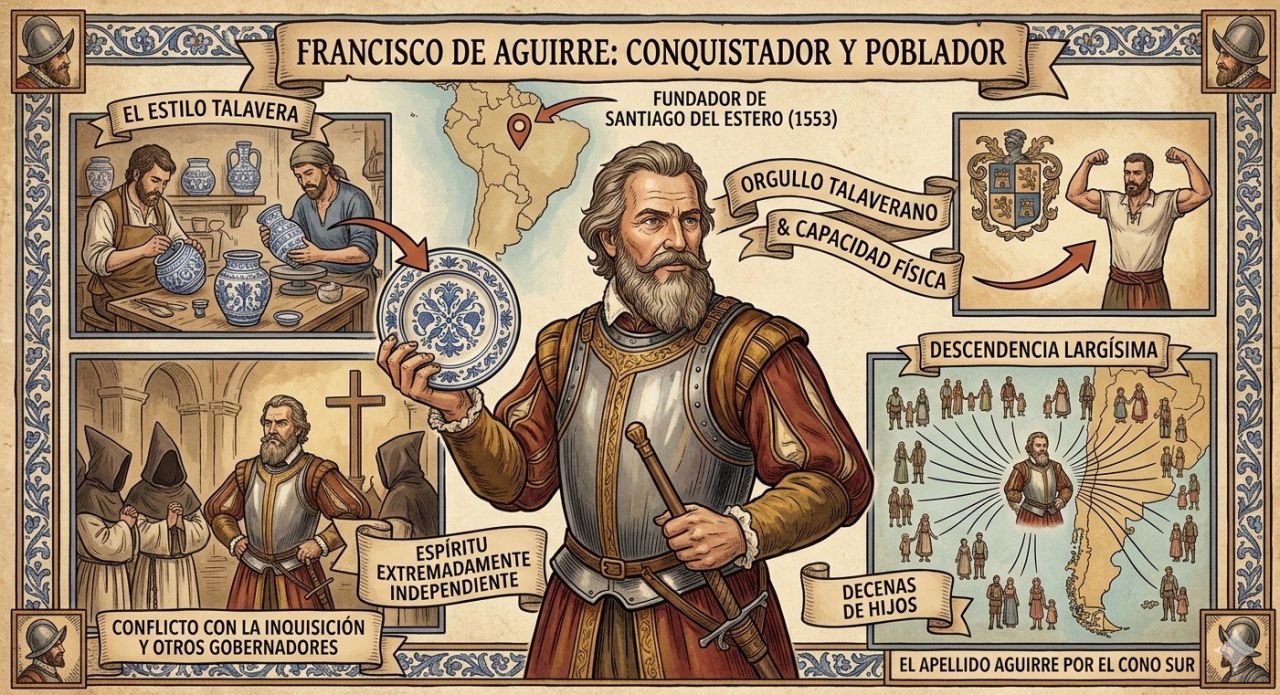 La placa conmemorativa de Francisco de Aguirre fue vandalizada hace muchos años. Jardines del Prado y sus paneles cerámicos de la Basílica en Talavera. Oropesa, Castillo y Palacio de los Condes (cuna del Virrey Toledo).