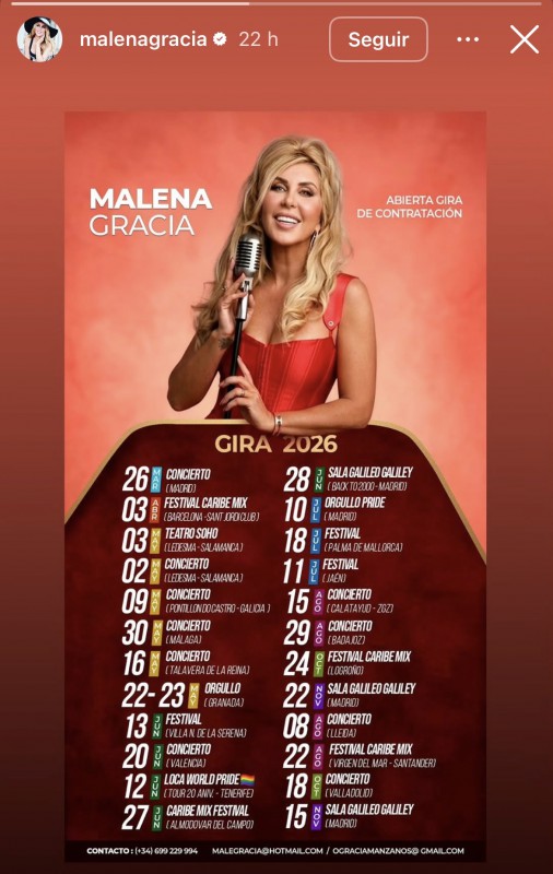 La cantante Malena Gracia ha publicado recientemente las fechas de su gira 2026 en su cuenta oficial de Instagram —al final de esta información—, y donde podemos ver que actuará en la Ciudad de la Cerámica el próximo sábado 16 de mayo, en pleno corazón de las fiestas locales.