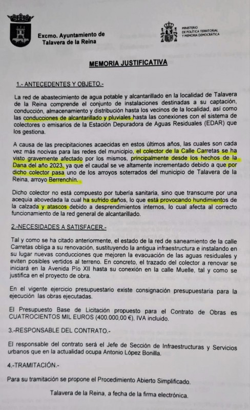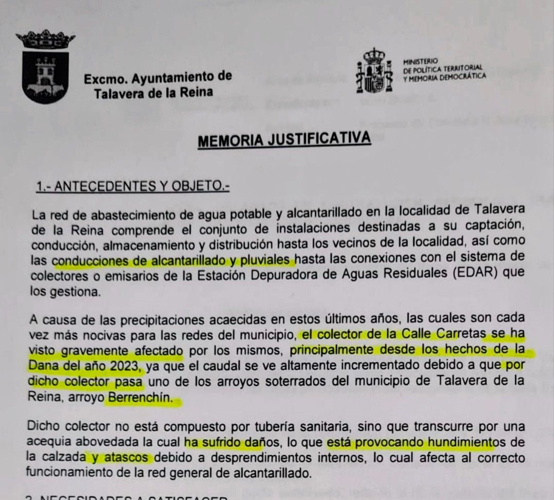 El Grupo Municipal Socialista de Talavera de la Reina ha denunciado que "un informe técnico del propio Ayuntamiento confirma la existencia de atascos y daños estructurales en el colector de la calle Carretas desde la DANA de 2023, información que contradice las reiteradas afirmaciones del alcalde, José Julián Gregorio, quien negó en varias ocasiones que estos problemas hubieran influido en las inundaciones del pasado mes de febrero".