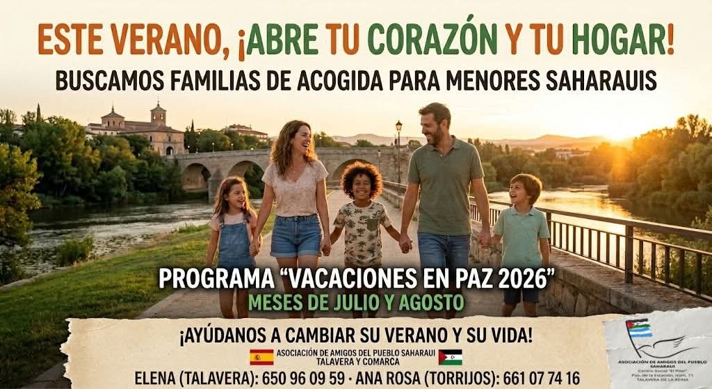 La Asociación de Amigos del Pueblo Saharaui de Talavera y comarca ha lanzado un llamamiento urgente a la solidaridad ciudadana para encontrar cinco familias de acogida que participen en el programa “Vacaciones en Paz 2026”, una iniciativa que permite a menores saharauis pasar los meses de julio y agosto en España.