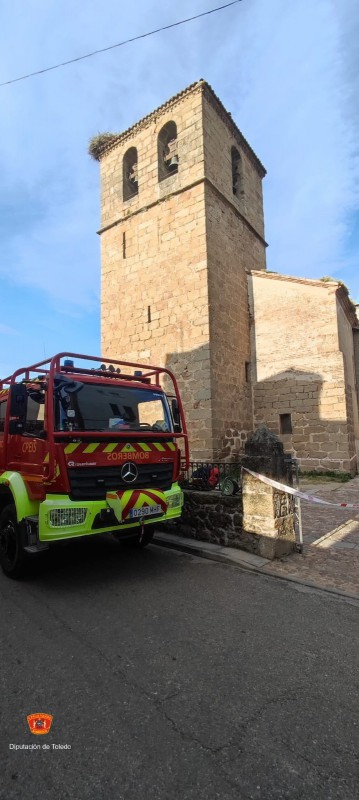 Efectivos del Consorcio Provincial de Extinción de Incendios y Salvamento (CPEIS) de Toledo intervinieron este viernes en la localidad toledana de Navalcán para gestionar la presencia de un enjambre de abejas localizado a pie de calle, en las inmediaciones de la iglesia del municipio.