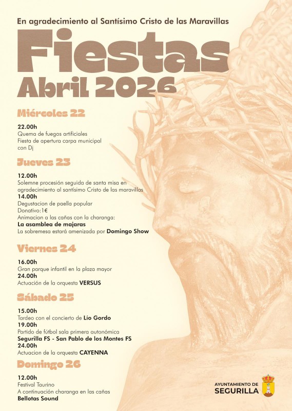 El municipio de Segurilla (Toledo) celebrará del 22 al 26 de abril sus fiestas en honor al Santísimo Cristo de las Maravillas, con un programa que combina actos religiosos, actividades populares y una intensa agenda musical.